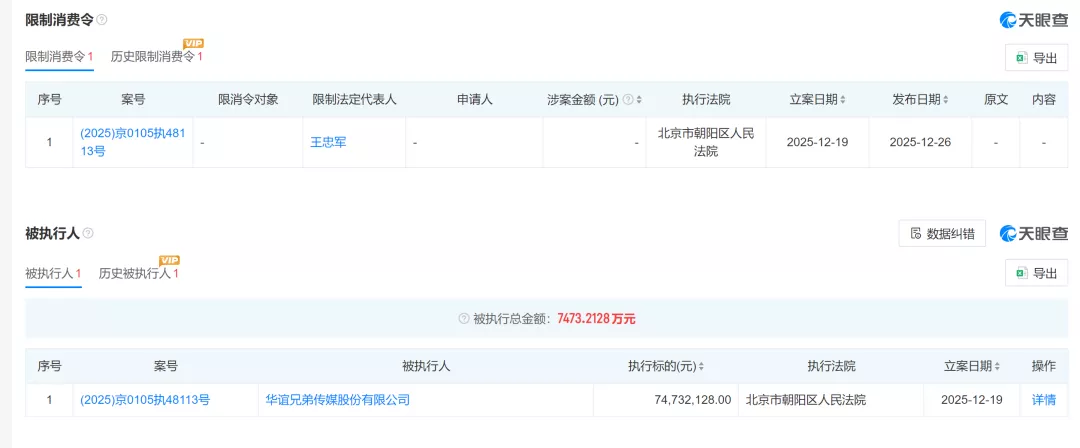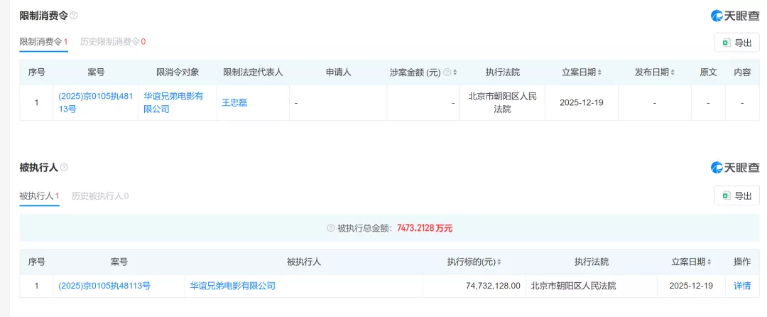 据天眼查官网显示,近日华谊兄弟旗下两家核心公司华谊兄弟电影有限公司、华谊兄弟传媒股份有限公司及其法定代表人王忠磊、王忠军被北京市朝阳区人民法院限制高消费,涉及7473万元执行案件。