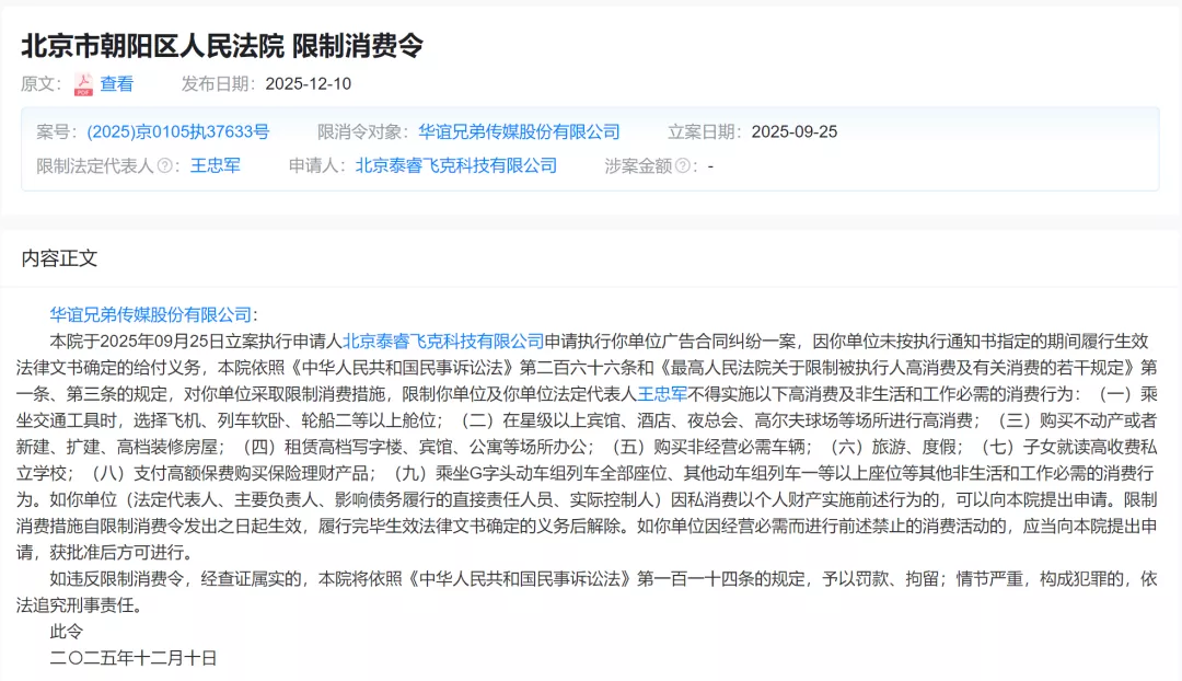 华谊兄弟及其创始人王忠军、王忠磊被限制高消费