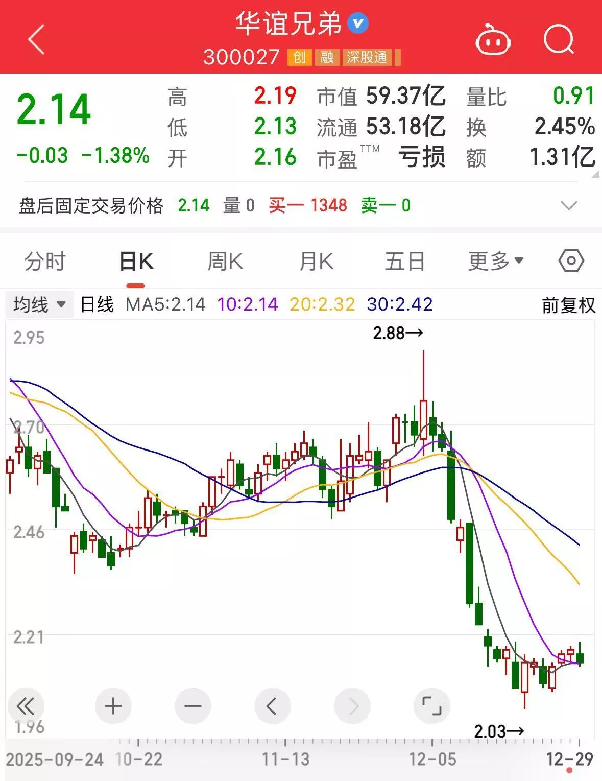 市场上,华谊兄弟近年来股价持续走低,截至29日收盘报2.14元,总市值仅剩59.37亿元,不及巅峰时十分之一。