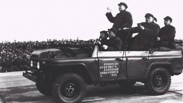 车队驶近,是清一色的敞篷吉普车,毛主席头戴军帽,穿着大衣,神情严肃地站在第一辆车上,右手举起,微微摆动。当吉普车经过面前的时刻,我看到他的脸色有些苍白,并不像平时看到的画像那样火红,且有一些老人斑。第二辆车上,站着林彪和周恩来,林彪戴着一顶无沿的皮帽,两人都一手举着红宝书,面带微笑。后面车上的人,我不知是谁,唯江青特别引人注目,别人都是面向前方,她却一手抓着吉普车上的扶手,上半身往一边探出,满面笑容地举着红宝书,向红卫兵致意。