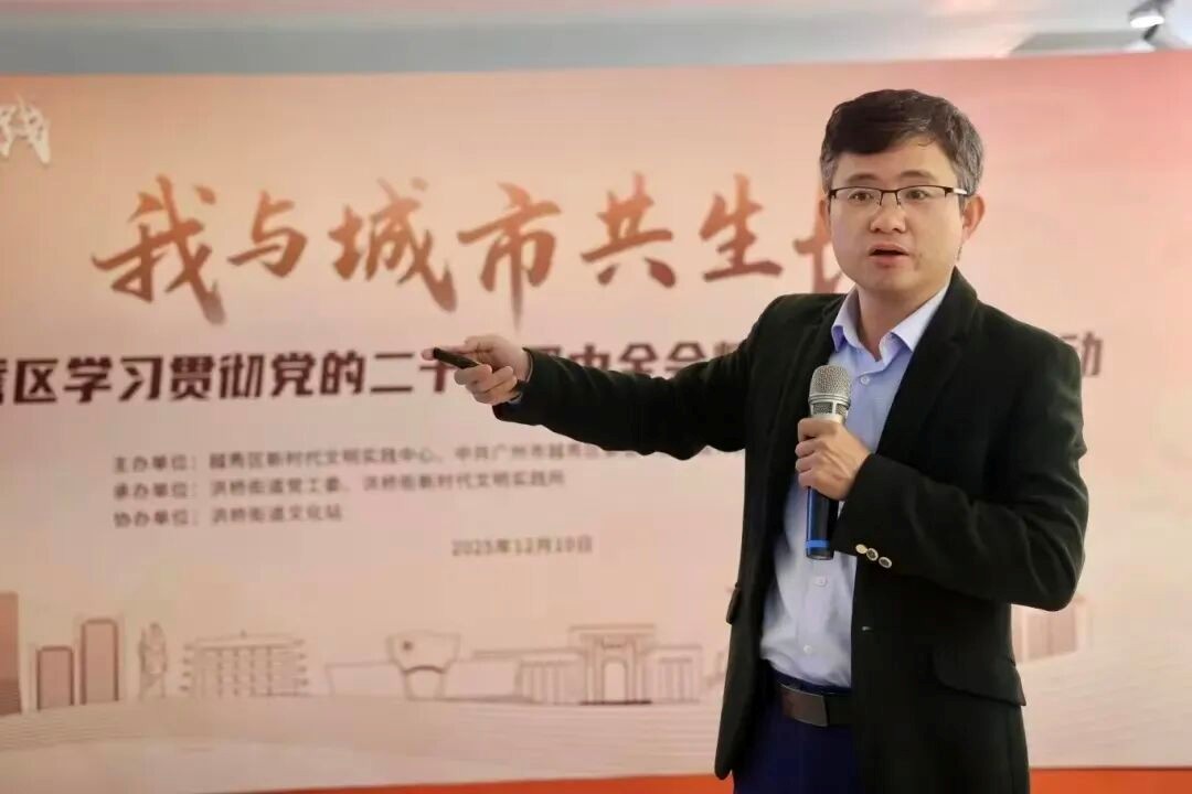 在广州市东风东教育集团番禺小学,广大马院副院长吴阳松围绕学习贯彻党的二十届四中全会精神,从重要意义、核心要义、实践要求三个维度进行阐释,为学生们带来了一堂生动的理论课。此外,吴阳松在越秀区洪桥街道宣讲时,结合广州及越秀区在推动高质量发展、增进民生福祉、强化创新驱动等领域的生动实践与鲜活案例,为现场干部群众架起了一座连接理论与现实的坚实桥梁。