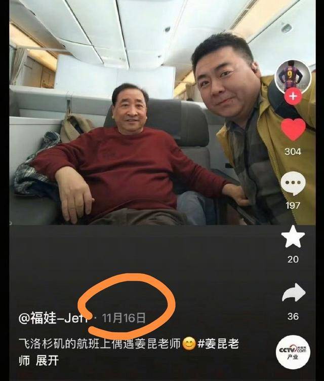 有人翻出11月中旬照片,姜昆在飞洛杉矶航班上被拍到,坐头等舱。