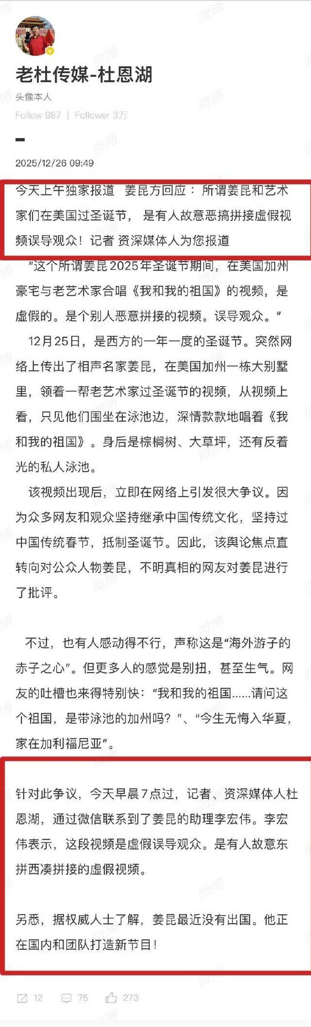 助理李宏伟跳出来辟谣,说视频是拼接的假的,姜昆最近没出国在国内排新节目。