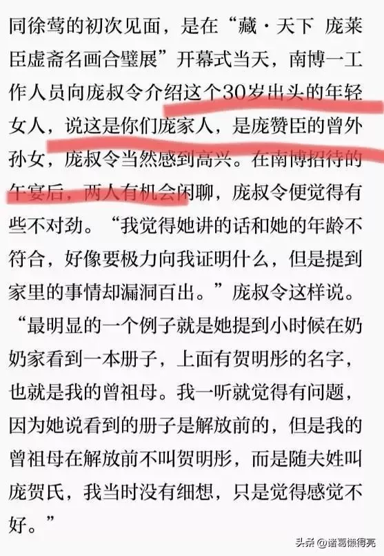 可2014年一场南京博物院的高端展览,让她的人生开了挂——策展人把她包装成民国收藏大佬庞莱臣堂弟“庞赞臣”的曾外孙女,南博前院长徐湖平还亲自到场背书。有了顶级机构撑腰,徐莺的“世家后人”人设直接焊死,不仅在文博圈混得风生水起,还敢对着媒体胡编家族史,把假身份吹得天花乱坠。