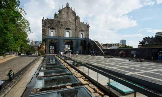 “大三巴牌坊”----本身就是一个中西杂糅的名称。“大三巴”为葡语“圣保禄”(São Paulo)中文音译,“牌坊”则是对其形制的中式“昵称”,它还有一个直观表达身世的名字“圣保禄教堂前壁”。圣保禄教堂最早建于1583年,在1595年和1601年先后发生几次大火而烧毁重建。后来,1630年新教堂落成,1640年加建的前壁和石阶完成,是当时远东最大的天主教石建教堂。又过了两百年,1835年,一场大火让教堂付之一炬,仅余前壁和壁前68级石阶,化身成为澳门最富有价值的瑰丽遗产,也将一段于澳门而言日后能够成为东西文明交汇地的最重要历史“折叠”其中。