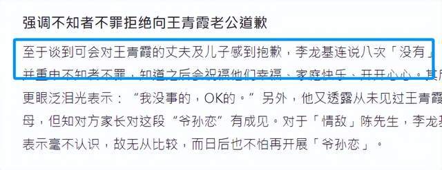 按理来说,既然知道了自己是第三者,李龙基应该向王青霞的老公道歉,但他在采访中却拒绝了这一行为。