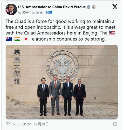 据美国驻中国大使庞德伟在X平台发布,在共军环台军演之际,“四方安全对话”包括美国、日本、印度、澳洲的大使12月30日在北京会面。庞德伟表示,“四方安全对话”是维护自由开放的印太地区的力量,四国关系持续稳固强劲。