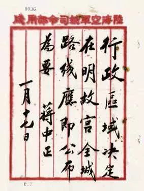 就在《首都计划》呈交蒋介石任主席的南京国民政府首都建设委员会的第18天,即1930年1月18日,国民政府突然发下训令第18号,下令将原定在紫金山南麓的中央政治区改设在明故宫地区。而训令只是写于一张“陆海空军总司令部用笺”的便笺。便笺上只有20个字“行政区域决定在明故宫全城路线应即公布为要”,署名与日期为“蒋中正 一月十七日” 。