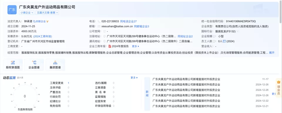据企业预警通显示,广东央莫龙户外运动用品有限公司的法定代表人为钟承湛,投资凯乐石比例达81.8182%。