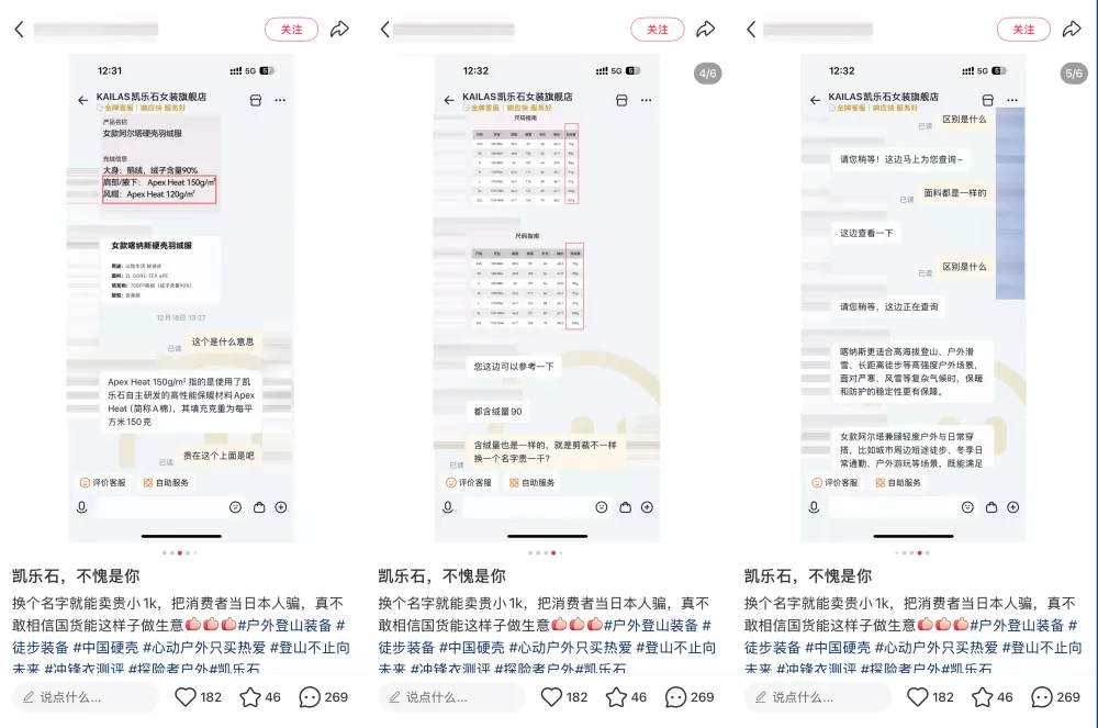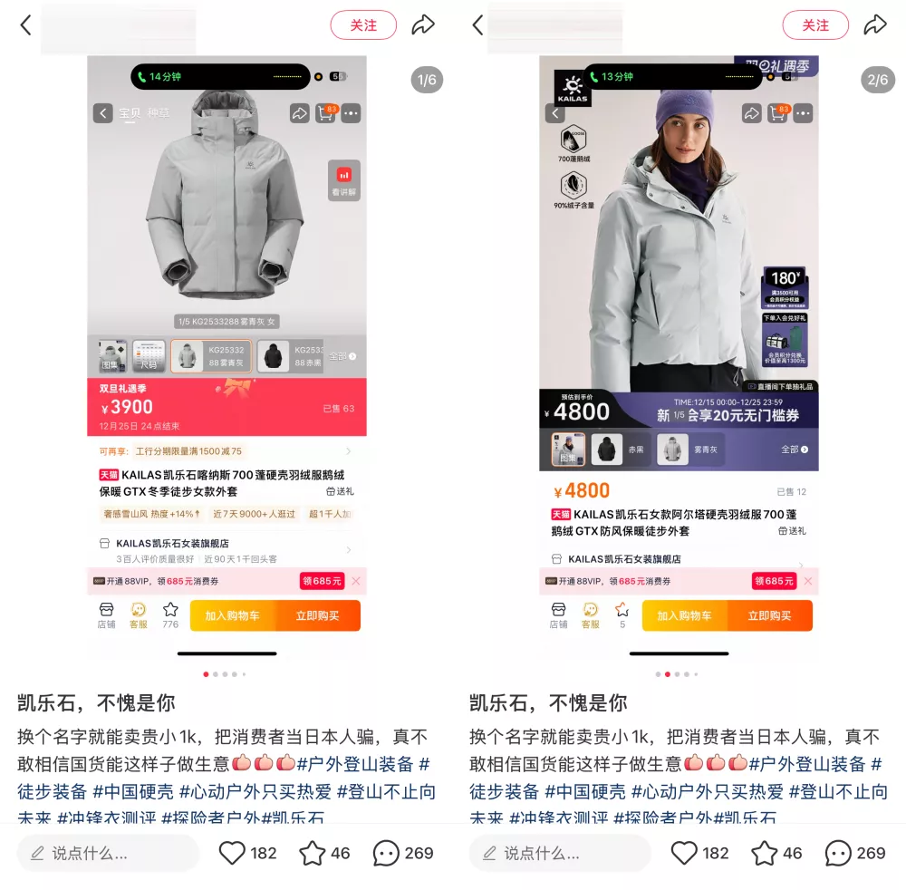 据消费者在某社交媒体平台发布题为「凯乐石,不愧是你」的帖子中称,“喀纳斯”羽绒服与新推出的“阿尔塔”羽绒服在外观设计、充绒量等参数上几乎一致,但售价却从3900元跃升至4800元,相差900元。