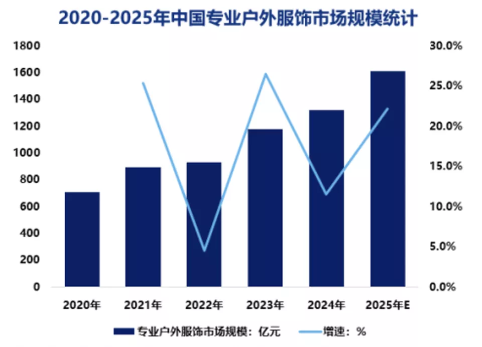 据智研咨询12月27日发布的报告显示,近年来,随着滑雪、徒步、登山等户外运动的普及,户外服装市场需求持续增长,行业规模不断扩大。2024年中国专业户外服饰行业市场规模从2020年的712亿元增长至1319亿元,预计2025年中国专业户外服饰行业市场规模有望突破1600亿元。