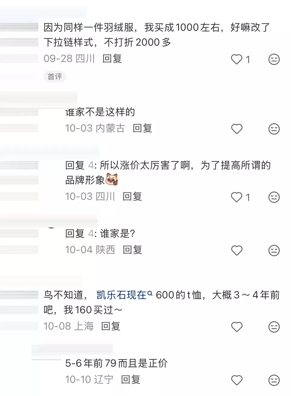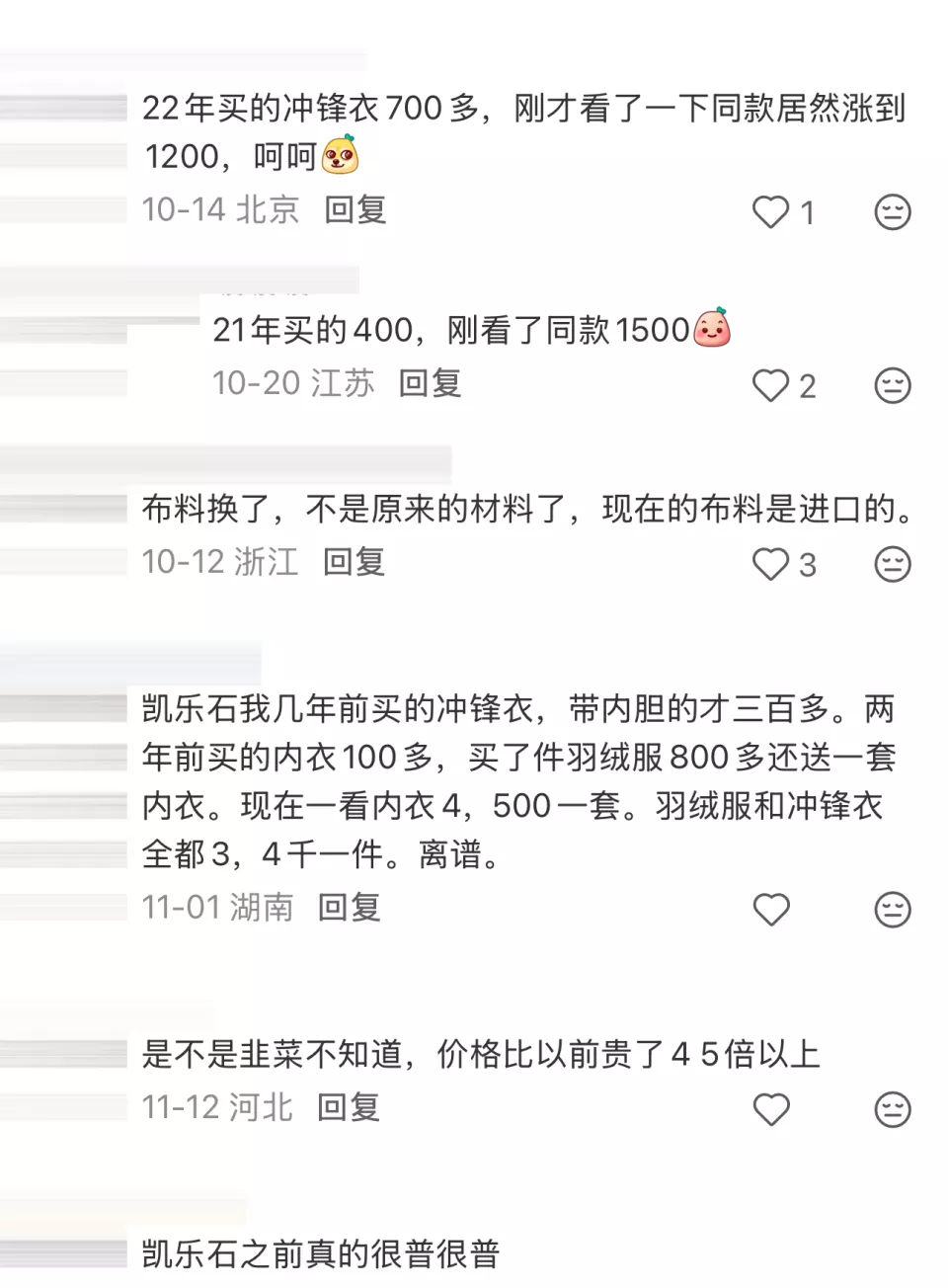 在某社交媒体平台上,关于凯乐石价格的讨论时有发生。有消费者表示,“凯乐石现在600的t恤,大概3~4年前吧,我160买过。”也有消费者表示:“布料换了,不是原来的材料了,现在的布料是进口的。”