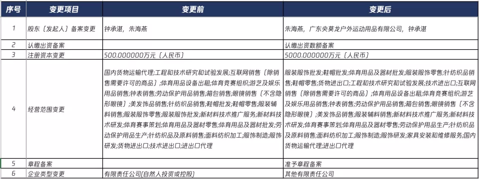 股东结构调整方面,原股东为钟承湛、朱海燕两位自然人,变更后新增“广东央莫龙户外运动用品有限公司”作为股东,形成新的三方股东架构。