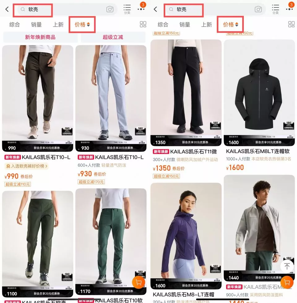 腾讯财经在官方旗舰店搜索发现,按价格从低到高排序,目前最便宜的软壳裤售价达930元,徒步衣则要1600元。
