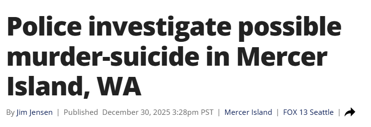 目前,警方正在调查周二(30日)发生在默瑟岛的一起疑似谋杀后自杀案件,一名母亲和她的儿子在这起事件中丧生。