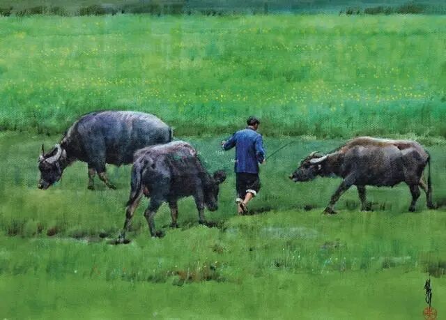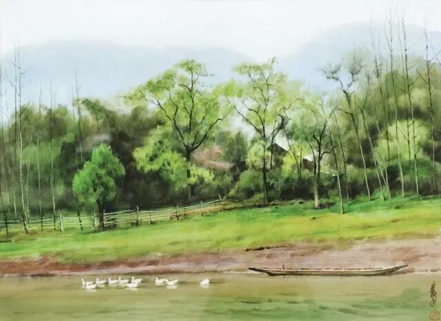 其作品水色交融间滋润、清透,兼之轻盈的笔触,鲜亮的色彩