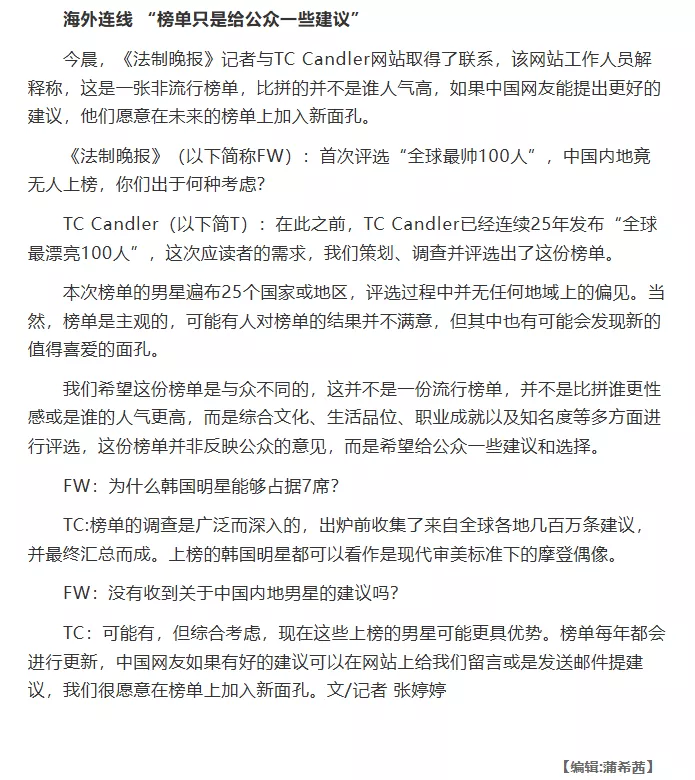 TC Candler自1990年起每年发布全球百大最美面孔榜单。