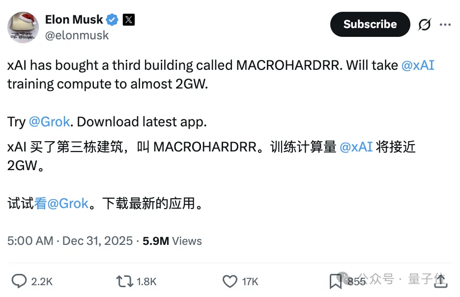 马斯克买了新厂房上GPU:2GW供电量子位