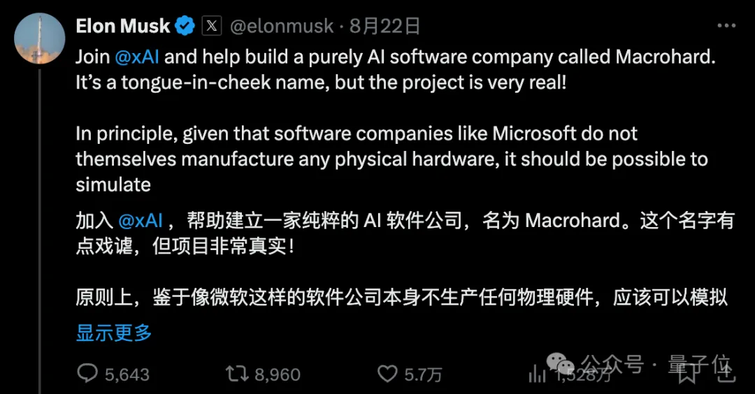 马斯克巨硬(Macrohard)项目,也是在8月份公开的。