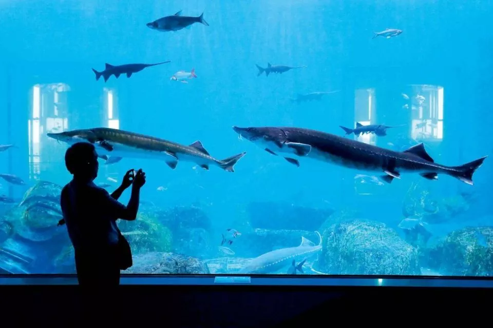 江西九江市湖口县,长江鄱阳湖水生生物保护中心淡水鱼类展示馆内展示的鲟鱼、胭脂鱼、金吉罗、射水鱼等百余种鱼类。图/新华