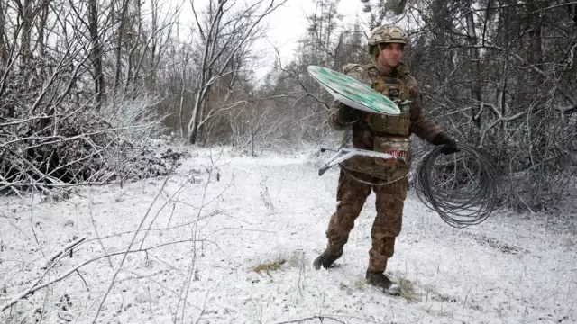 乌克兰克雷明纳一名乌军士兵收起一座SpaceX星链卫星接收器。星链透过卫星星座提供互联网连线,SpaceX透过可重复使用火箭来控制发射数以百计人造卫星的成本。