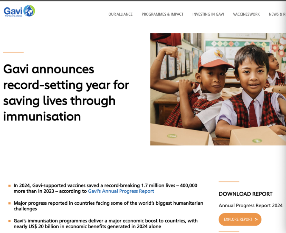 Gavi,全球疫苗免疫联盟,2000年成立,旨在为全球儿童提供疫苗保护。该组织声称,他们是超过半数世界儿童的免疫来源,已帮助78个低收入国家的12亿儿童接种了各式疫苗,预防了2060多万人的未来死亡。