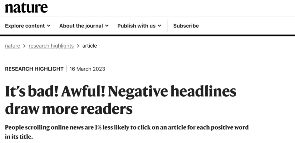 这种倾向对我们的生活和认识影响有多大?《Nature》2023年发布的一篇论文,说明了这一点:“标题中每出现一个正面词汇,人们点击该标题的可能性就会降低1% 。”