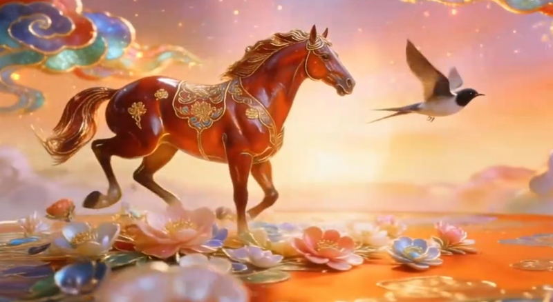 北京卫视2026春晚骏马踏花而过,而“华”是“花”的古字。(图撷自bilibili)