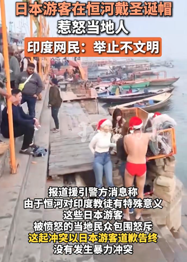 报道援引警方消息称,这起冲突发生于12月25日,当时多名日本游客头戴圣诞帽在当地一处码头前玩耍打闹,其中一名男子还脱掉外衣准备下河游泳。由于恒河对印度教徒有特殊意义,这些日本游客被愤怒的当地民众包围怒斥。警方称,这起冲突以日本游客道歉告终,没有发生暴力冲突。