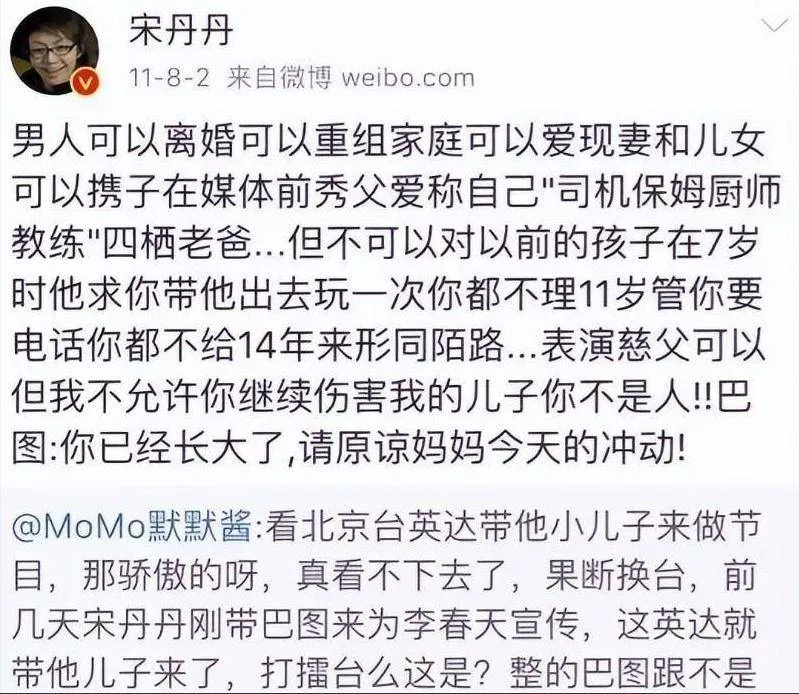 此后多年,两人经常公开互撕,除了“婚内忠诚与否”的问题,还有一个很重要的纠纷点就是英达对儿子巴图的态度。