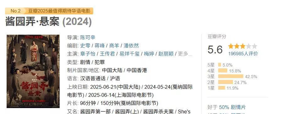 很多网友都好奇,她连这种水奖都要特意去拿,而且拿奖的这部《酱园弄》,豆瓣评分在及格线以下,已经是公认的烂片了。