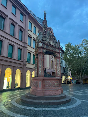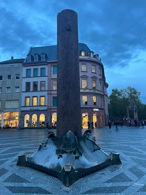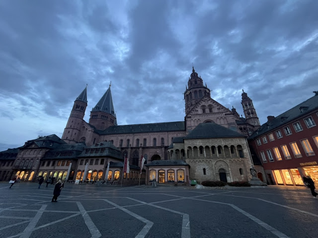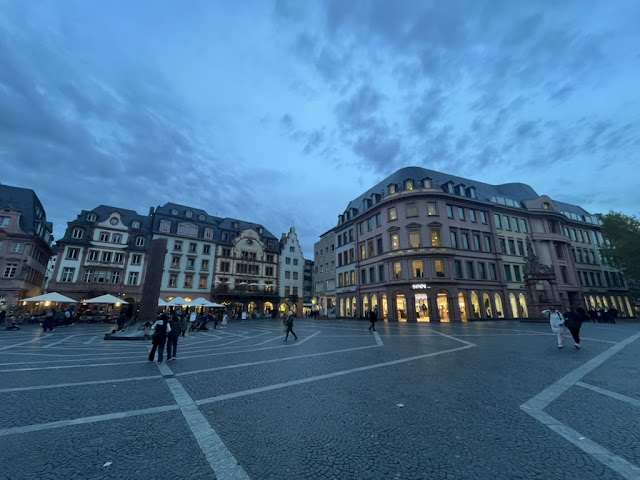 走出美因茨大教堂,视线立刻被打开,脚下便是 Domplatz——这座城市最核心、也最具日常气息的广场。傍晚时分,天空的蓝色尚未完全褪去,周围建筑的窗户逐渐亮起灯光,广场在明暗交替之间显得格外宽阔而平静。
