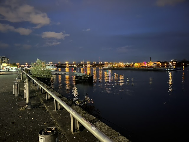 夜幕降临,沿着河岸慢慢走向莱茵河的水边,城市的节奏忽然放缓。白天承载历史与叙事的建筑逐渐退到暗影中,只剩下桥上的灯光一盏盏亮起,在水面上拉出细长而摇曳的倒影。河水安静地向前流去,仿佛从不关心人世间的王权、信仰或革命,只是持续地把时间带走。