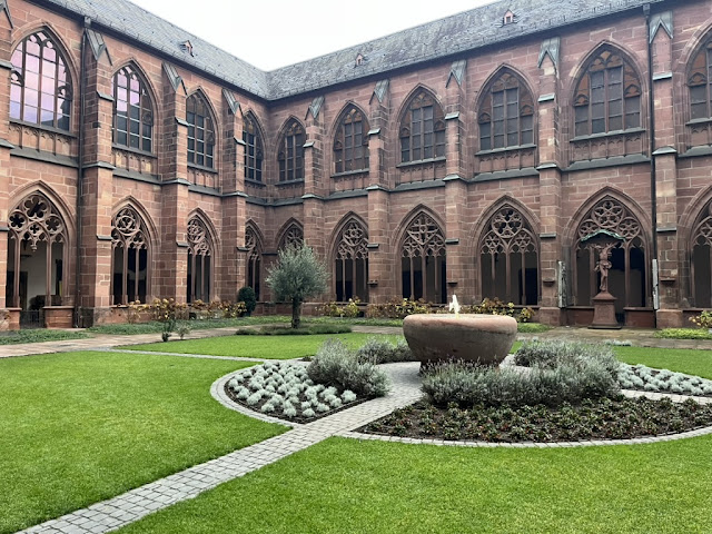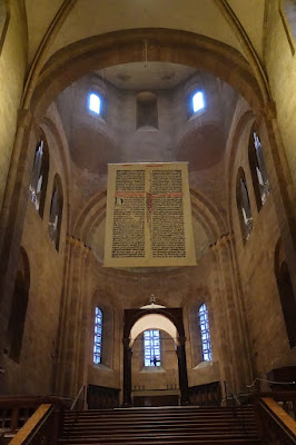 走入教堂内部,一如既往地神圣而庄严,石柱与拱顶构成了厚重而华丽的空间秩序。然而其中最引人注意的,并非祭坛或雕塑,而是悬挂在中殿上方的一页《古腾堡圣经》复制品。这并非装饰,而是一种明确的致敬。约在 1450 年前后,约翰内斯·古腾堡在美因茨印刷了改变历史的《四十二行圣经》。通过金属活字印刷,圣经第一次得以被大量复制,从原本只掌握在少数僧侣手中的文本,走向了普罗大众。这种传播方式的转变,不仅改变了知识的流通,也在无形中为半个世纪后的宗教改革,预备了最关键的媒介条件。