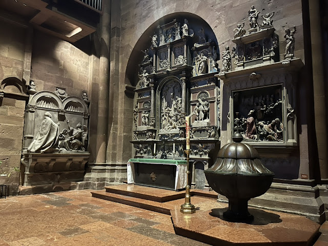 教堂里另一件比较特别的物件是纳沙威(Nassau)的家族祭坛。祭坛雕刻于 1601 年左右,采用的是艾费尔火山凝灰岩(Eifel tuff),各种细节让人叹为观止。这座祭坛是为纪念帝国议会议员菲利普·冯·纳沙威-斯普肯堡(Philipp of Nassau-Spurkenburg,1582年逝世)及其兄弟——大教堂参议会成员亨利·冯·纳沙威(Henry of Nassau,1601年逝世)而建。由于他们是该家族绝嗣前的最后成员,因此在祭坛顶层的纳沙威家族纹章是倒置的(象征家族血脉的终结),这个是我以前在其他教堂从来没有注意到的。