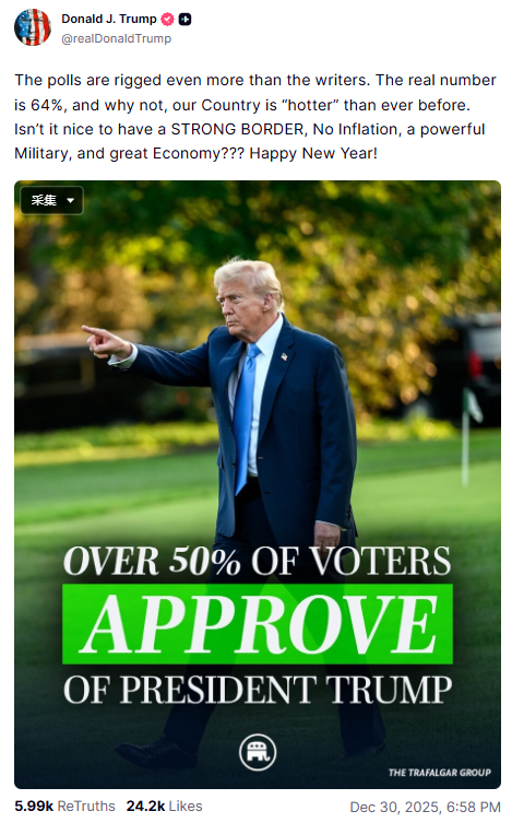 “这些民调比编剧们操纵得更厉害。”川普在深夜发布于Truth Social的帖子中表示。“真正的数字是64%,而且为什么不呢?我们的国家比以往任何时候都更‘火热’。”