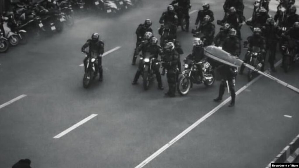 在网上流传的画面显示一名伊朗抗议者面对骑摩托车赶到现场驱逐人群的伊朗安全部队,勇敢地静坐在德黑兰街头,拒绝离开。美国国务院在X平台的波斯语账号转发了这幅图像。