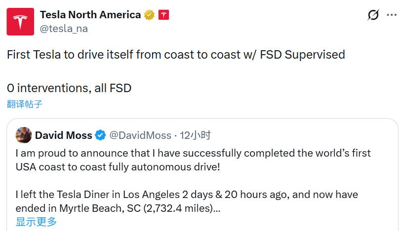 这一举动也引发了特斯拉社区的瞩目。特斯拉北美官方账号表示:“首辆实现全程自动驾驶横跨美国东西海岸的特斯拉。零人工接管,全程FSD。”