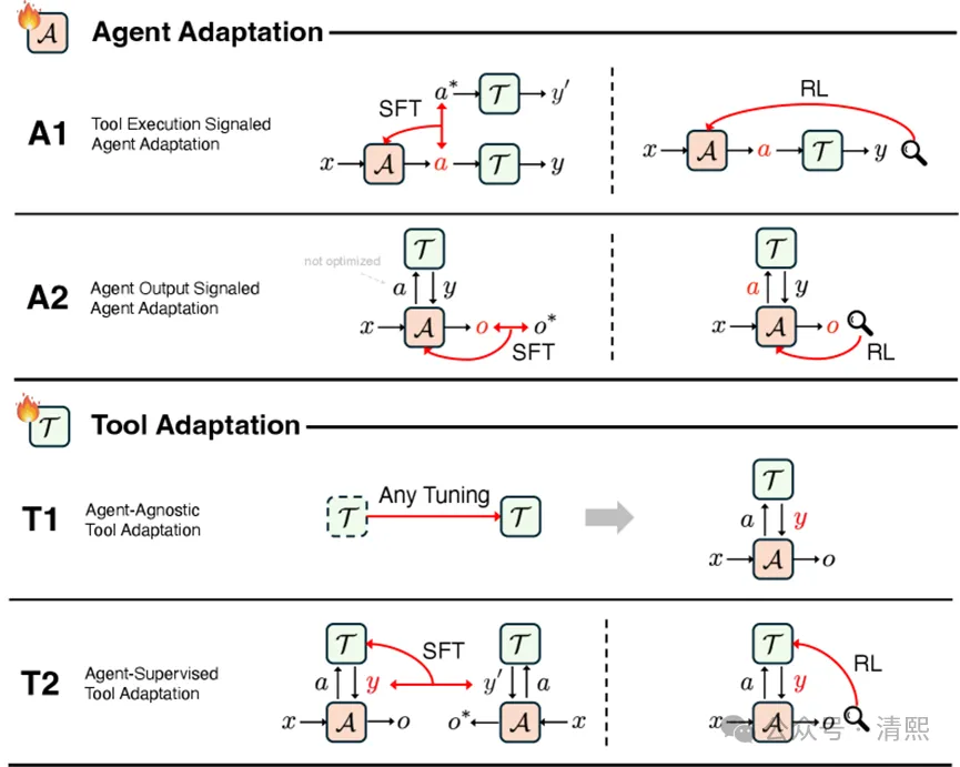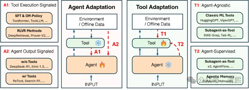 图1:智能体人工智能的适应性概览。智能体:作为协同推理模块的基础模型;工具:独立于智能体模型的可调用组件,例如API接口、机器学习模型、子智能体或记忆模块。我们将这些适应性调整分为两类:智能体适应性(A1 & A2):针对智能体模型的适配优化;工具适应性(T1 & T2):为智能体适配工具的调整。
