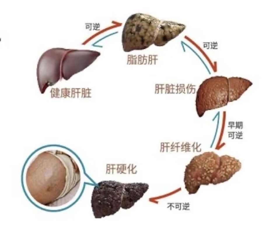 单纯性脂肪肝 → 脂肪性肝炎 → 肝纤维化→ 肝硬化 → 肝癌