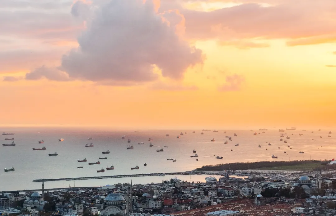 停泊在土耳其伊斯坦布尔马尔马拉海上的船只(无人机照片)。新华社记者刘磊摄
