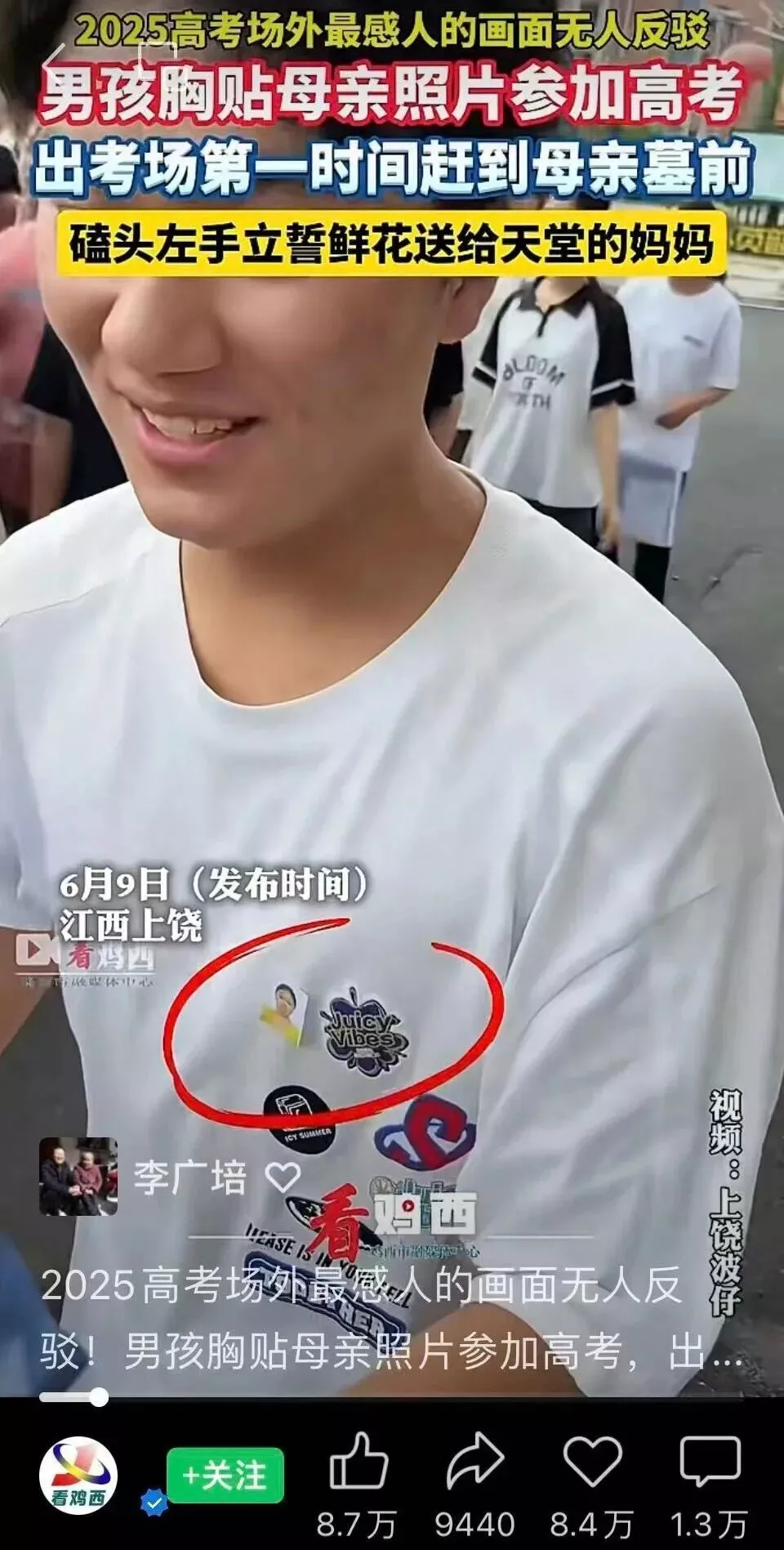 2025年的夏天,有个没娘的孩子,在左胸的心脏边贴着母亲的照片,走进了高考考场。