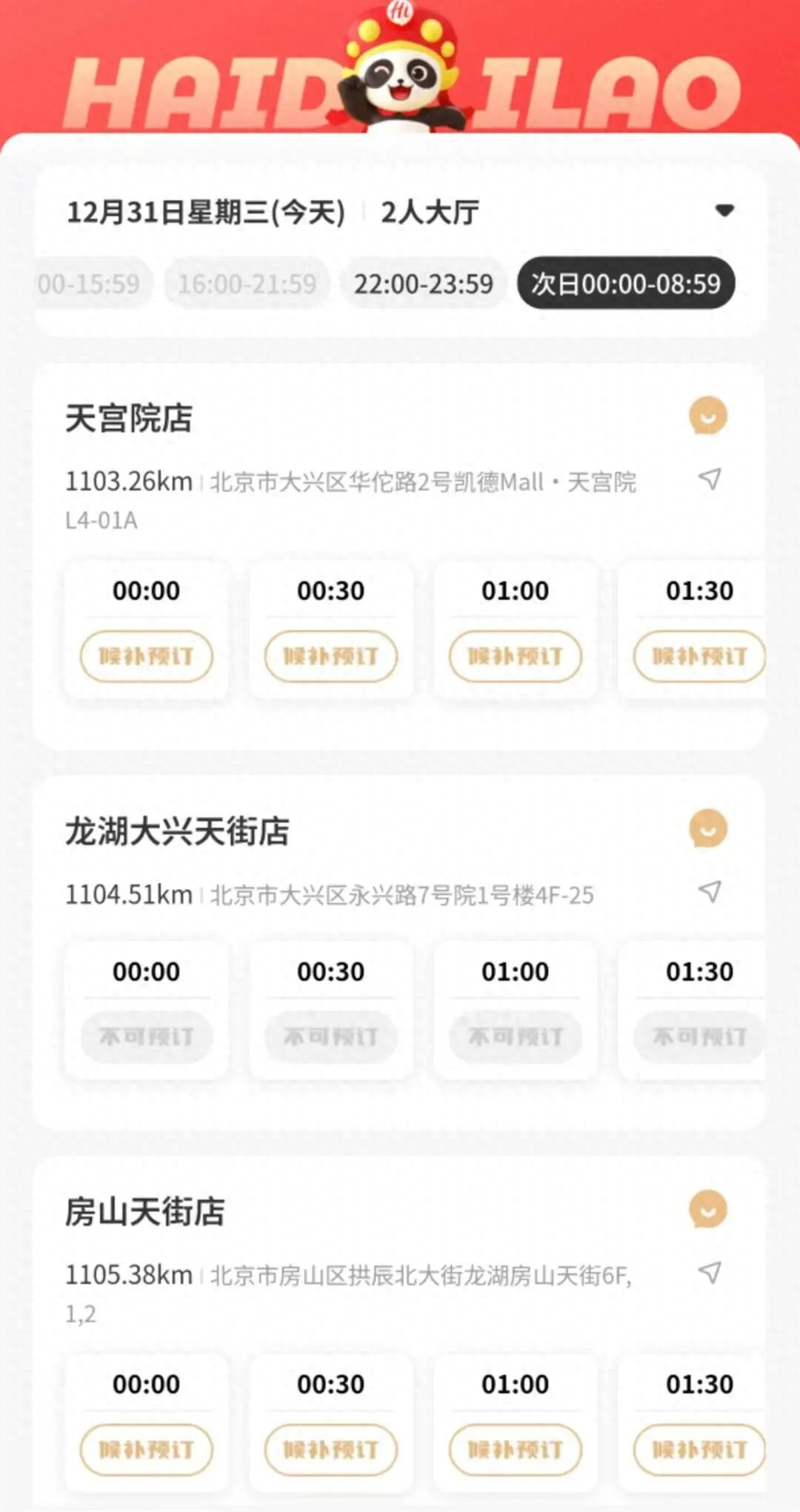 极目新闻记者查询北京市海底捞门店订座页面发现,选择2人或4人桌的大厅座位预订,12月31日22时至次日9时的时段内,多家门店座位已被订满。在排队页面,线上排号号码已达数百号,其中一家门店排号甚至到了1239号。不止北京,西安有网友发帖称,当地海底捞门店排队需排到1000多桌。记者注意到,二手交易平台上还出现了西安海底捞门店的代排服务,要价80元一桌。