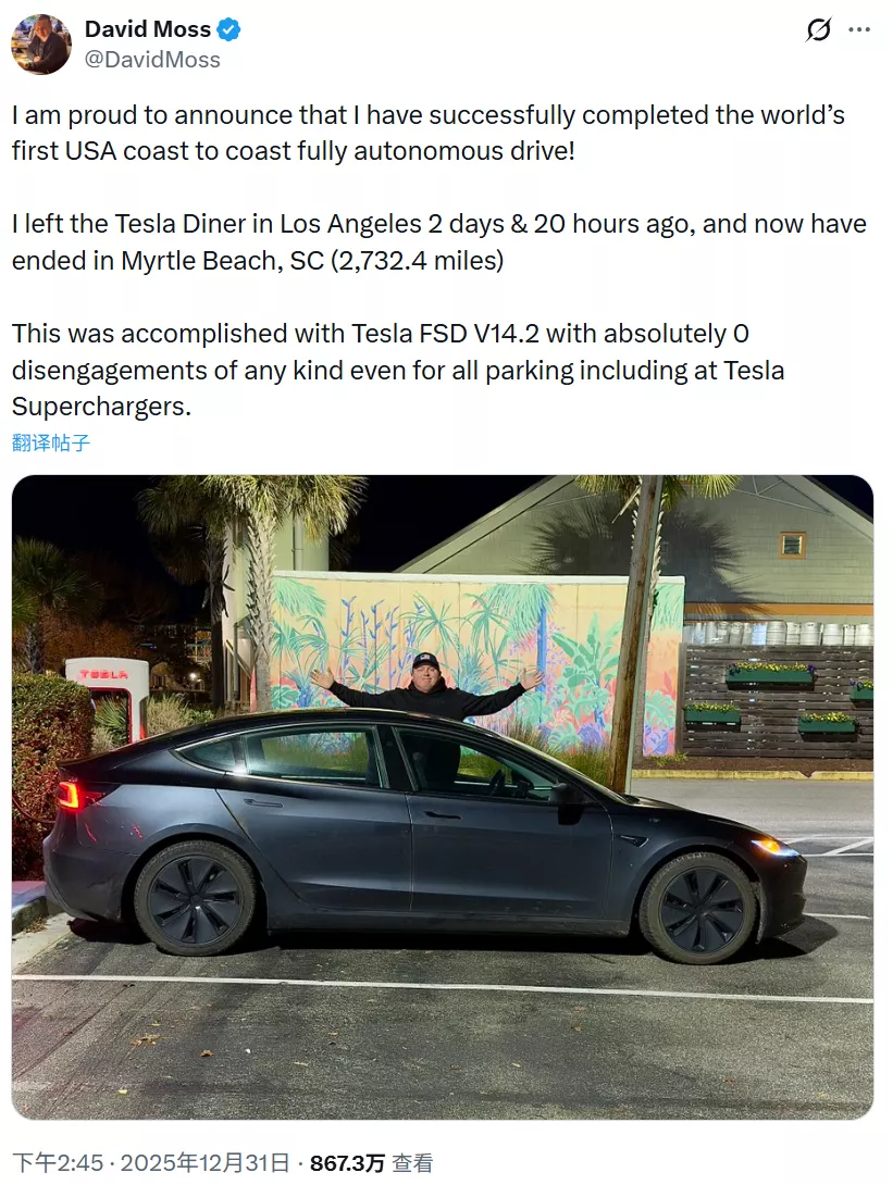在2025年的结尾,特斯拉车主大卫·摩斯(David Moss)实现了一项颇具时代特色的挑战:坐在他的Model 3里,静静地看着汽车自己从美国的西海岸开到东海岸,全程不进行任何干预。