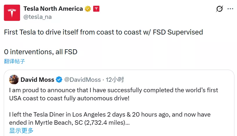 这一举动也引发了特斯拉社区的瞩目。特斯拉北美官方账号表示:“首辆实现全程自动驾驶横跨美国东西海岸的特斯拉。零人工接管,全程 FSD。”