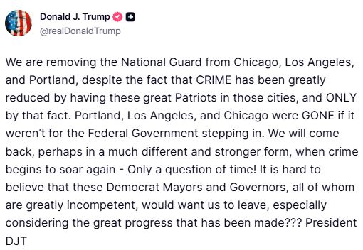 川普在跨年夜于自家社交媒体Truth Social发文表示:“当犯罪再次开始飙升时,我们会回来,或许会以一种非常不同、也更强势的方式回来。”川普的声明点名撤兵城市包括芝加哥与洛杉矶,也提到奥勒冈州波特兰,但并未提及华盛顿特区,目前当地仍有国民兵执行巡逻任务。