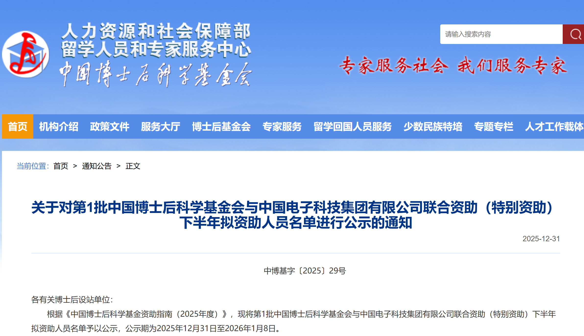 根据《中国博士后科学基金资助指南(2025年度)》,现将第1批中国博士后科学基金会与中国电子科技集团有限公司联合资助(特别资助)下半年拟资助人员名单予以公示,公示期为2025年12月31日至2026年1月8日。