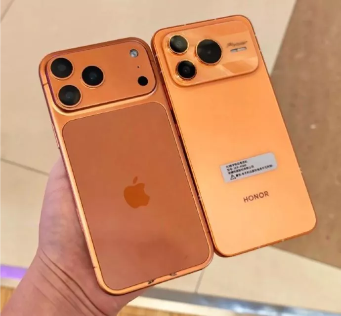 从一位博主近日发布的荣耀 Power 2与iPhone 17 Pro Max真机对比照片来看,荣耀 Power 2同样配备矩形Deco后置摄像头模组,尤其是Power 2的橙色版本,被指与iPhone 17 Pro系列的星宇橙配色“高度相似”。甚至有网友调侃称其是“抄作业”、“提前把iPhone 18 Pro Max端了上来”。