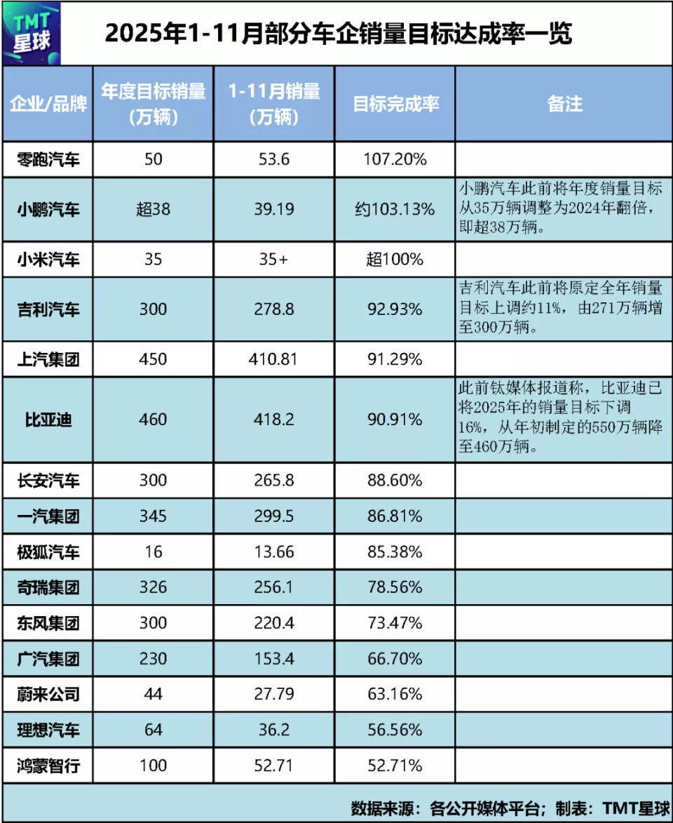 临近2025年末,各大车企的年度销量目标完成情况逐渐清晰,不同阵营的分化态势愈发显著。有的车企提前“撞线”,有的仍在全力冲刺,还有的已基本确定无法达标。