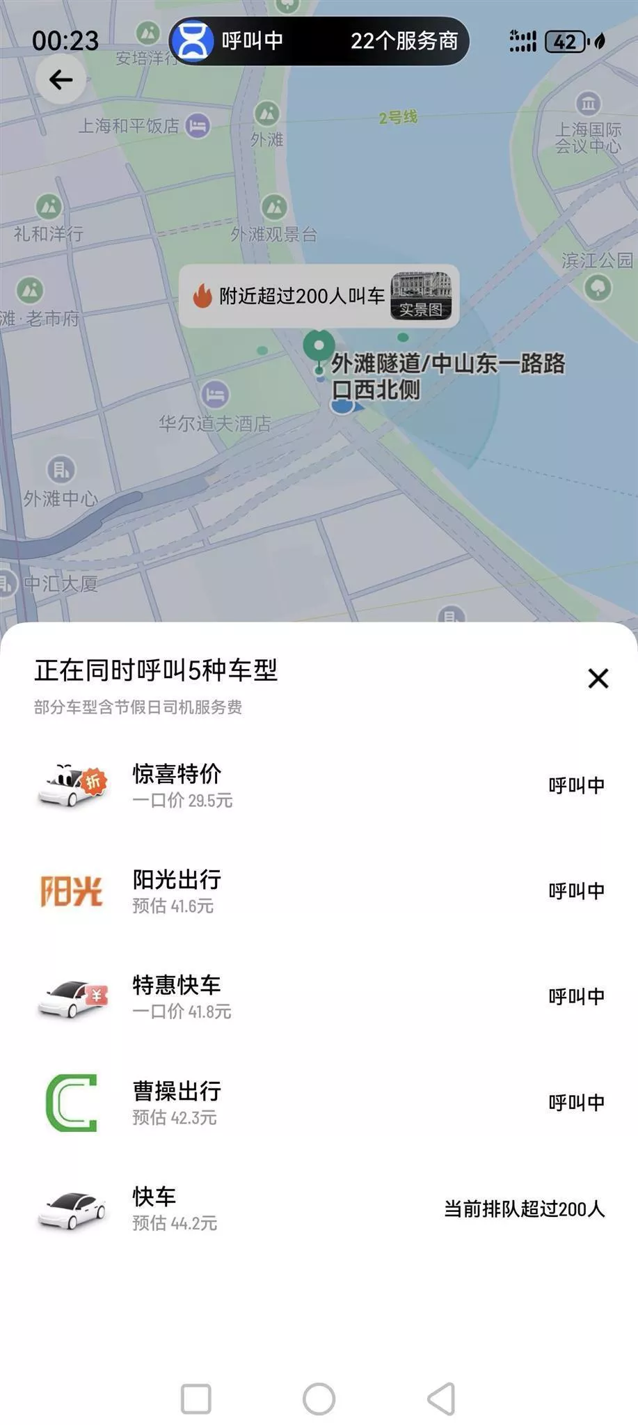 极目新闻记者随着人潮走出,手机上的打车软件提示“附近超过200人叫车”,直至凌晨3时许也是如此,下单许久打不到车。在货拉拉页面勾选车辆时显示“高峰”,要收取高峰服务费,记者下单20分钟,无人接单。